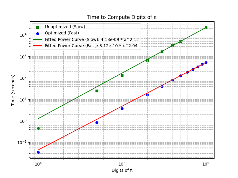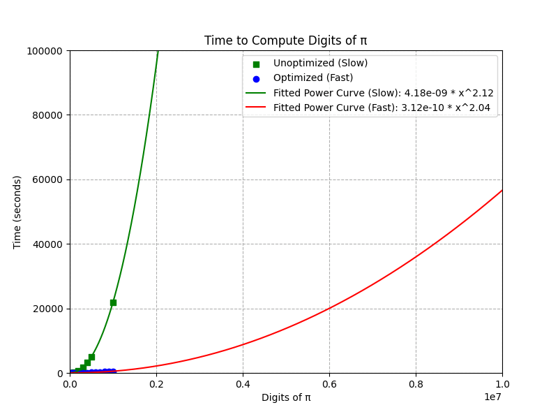 Comparing run times for the unoptimized vs the optimized version of our program we see that the optimization has made a bit improvement. The first graph shows a nearly linear relationship in log-log space suggesting a power relationship. Even though our data is best fit by a power function in both cases, the optimized version has reduced the power slightly. We can see in the middle graph, that the unoptimized version grows much more rapidly than the optimized version. Unfortunately the optimized version is still \(O(n^2)\) which means that if we project out to even larger numbers of digits we see that the quadratic growth will make it difficult to compute π as the number of digits increase. If only there was an algorithm that was closer to \(O(n)\) that we could use.